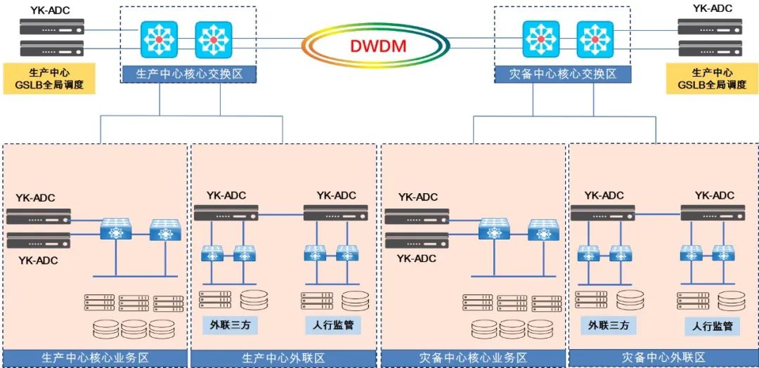 生產(chǎn)中心和災(zāi)備中心為對(duì)稱(chēng)部署,兩個(gè)中心使用波分技術(shù)實(shí)現(xiàn)互相連接;
