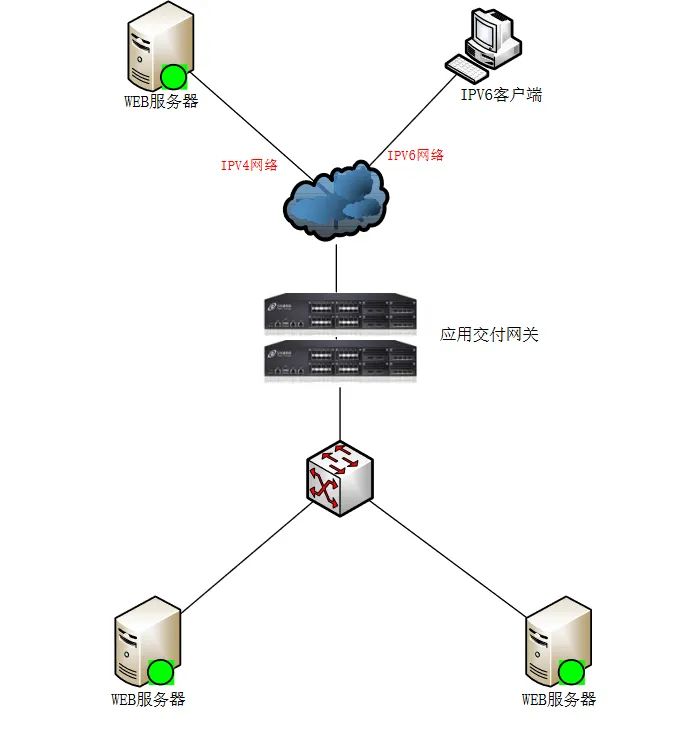 參見如下的網(wǎng)絡邏輯示意圖,應?交付控制器作為 IPv6 和 IPv4 的協(xié)議網(wǎng)關(guān)來部署,同時提供數(shù)據(jù)中心 Web 應用服務器集群的負載均衡等應用交付的功能。數(shù)據(jù)中心內(nèi)部的應用程序還沒有經(jīng)過 IPv6 的改造,依然是 IPv4 的環(huán)境,應用交付控制器分別連接 IPv6 和 IPv4 兩個網(wǎng)絡,通過虛擬服務器方式將數(shù)據(jù)中心的 Web 應用發(fā)布在 IPv6 的網(wǎng)絡中(圖中以虛擬服務器vs_main: 2017:1::158:80 對 IPv6 的客戶端發(fā)布),IPv6 網(wǎng)絡中的客戶端可以訪問應用交付網(wǎng)關(guān)發(fā)布的 IPv6 的虛擬服務器,通過代理的方式將請求轉(zhuǎn)發(fā)給數(shù)據(jù)中心內(nèi)部的真實服務器,得到響應內(nèi)容之后將返回的內(nèi)容再轉(zhuǎn)換成 IPv6 數(shù)據(jù)包返給客戶端,從而保證客戶端能夠在?個 IPv6 的網(wǎng)絡中訪問數(shù)據(jù)中心 IPv4 的應用。