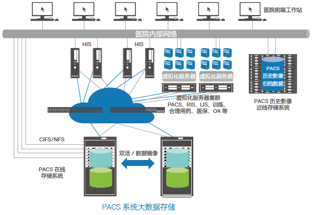 高速調(diào)用影像:采用 SAN+NAS 存儲(chǔ)作為核心存儲(chǔ),存儲(chǔ) PACS 系統(tǒng)數(shù)據(jù)庫和在線的 PACS影像文件,提供高速的數(shù)據(jù)訪問能力;